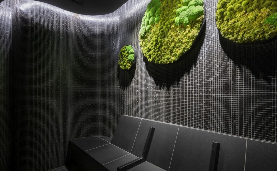 黒を基調とした内装は、薄暗くほかのサウナ利用者の存在を感じにくくしておりますので、情報をそぎ落としご自身に向き合う時間を表現しています。