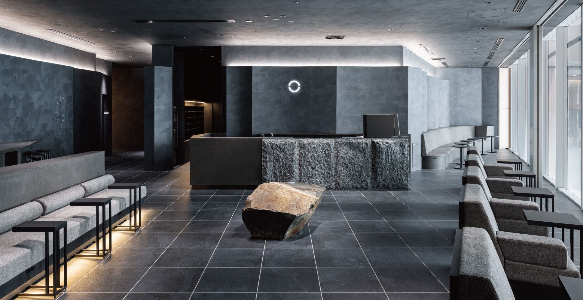 無の境地を探求する坐禅の際の半眼をコンセプトにデザイン。ベンチの下からもれる光の演出は、半眼の時にうっすら目に入る光を表現しています。
